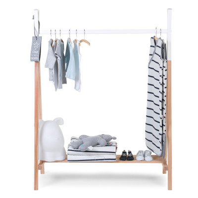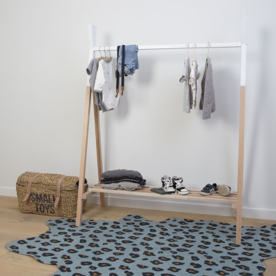 Este divertido perchero abierto estilo tipi es ideal para pequeños aventureros. El montante tiene un estante en la parte inferior y un estante para colgar en la parte superior para que pueda colgar fácilmente la ropa de su hijo.