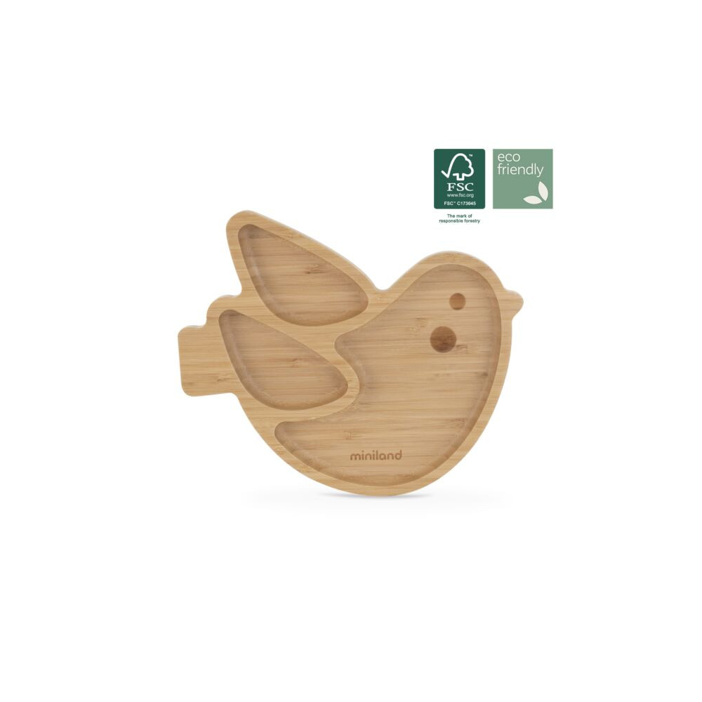 El plato está realizado 100% de madera de bambú certificada FSC y la ventosa con silicona de grado alimenticio.