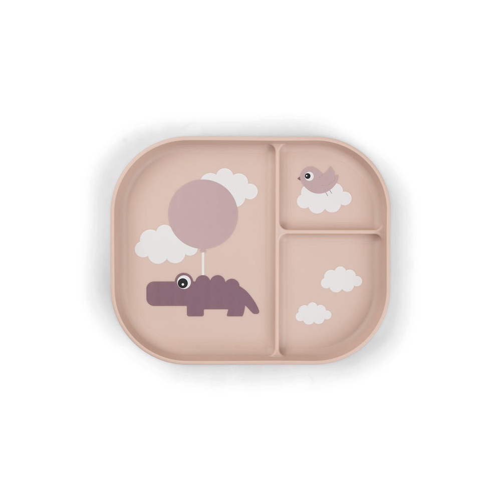 El plato con compartimentos en color polvo está estampado con un divertido motivo Happy Clouds. Croco y Birdee exploran el mundo entre las nubes e invitan a su hijo a experimentar nuevos sabores y consistencias. El polvo más oscuro de la base añade un detalle bicolor.