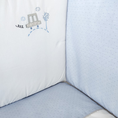 Su cualidad de tener un relleno desenfundable la convierte en una prenda versátil para ser utilizada en invierno y en verano y también ofrece la ventaja de ser lavada con facilidad. Dispone de 3 volantes que cumplen la función de vestir la cuna.