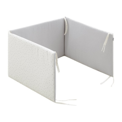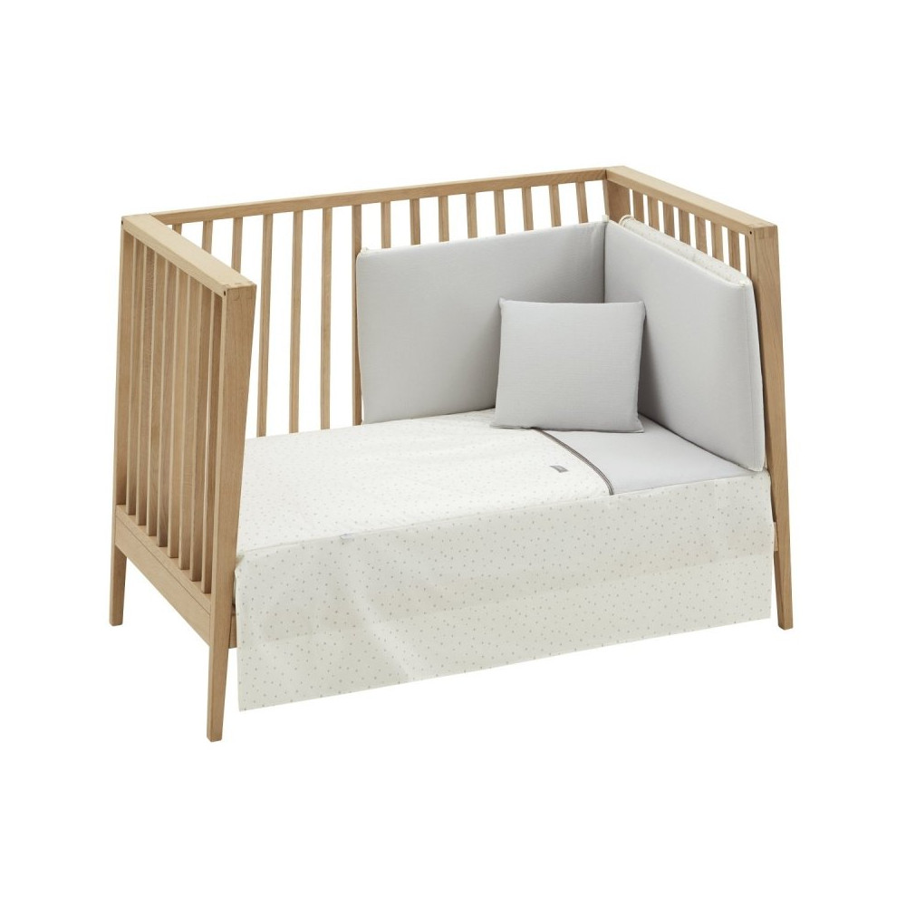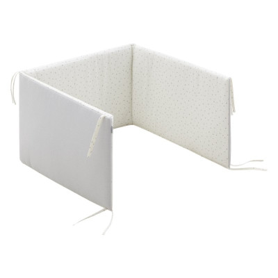 Dispone de 3 volantes que cumplen la función de vestir la cuna. El protector fabricado con tejido cuyo interior va acolchado con fibra hueca, amortigua los posibles golpes del bebe contra la cuna.
