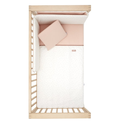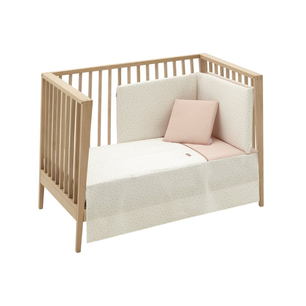 Dispone de 3 volantes que cumplen la función de vestir la cuna. El protector fabricado con tejido cuyo interior va acolchado con fibra hueca, amortigua los posibles golpes del bebe contra la cuna.