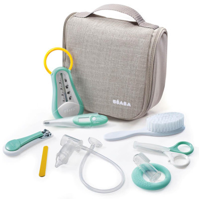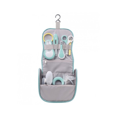 Neceser con gancho para colgar fácilmente en cualquier ocasión. Con un práctico diseño interior totalmente pensado para que puedas guardar todos los accesorios de higiene y limpieza de tu bebé: bandas elásticas, 2 bolsillos interiores con cremalleras y uno exterior en la parte posterior y, con asa para transportar cómodamente. Este neceser no viene solo, incluye 9 accesorios esenciales para el cuidado de tu bebé: termómetro de baño, termómetro digital, tijeras, cortauñas, cepillo de pelo, anillo de dentición, cepillo de encías, aspirador nasal y lima de uñas.