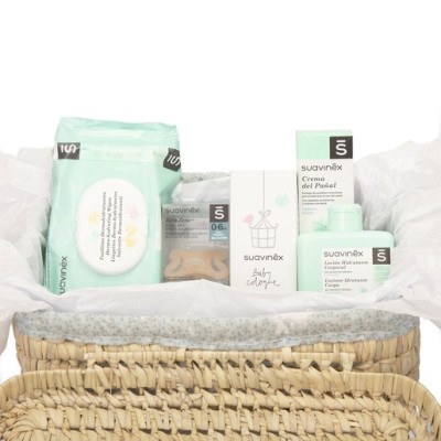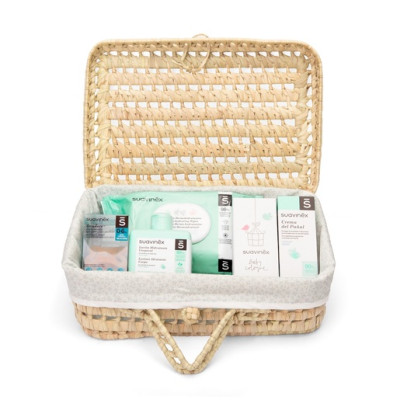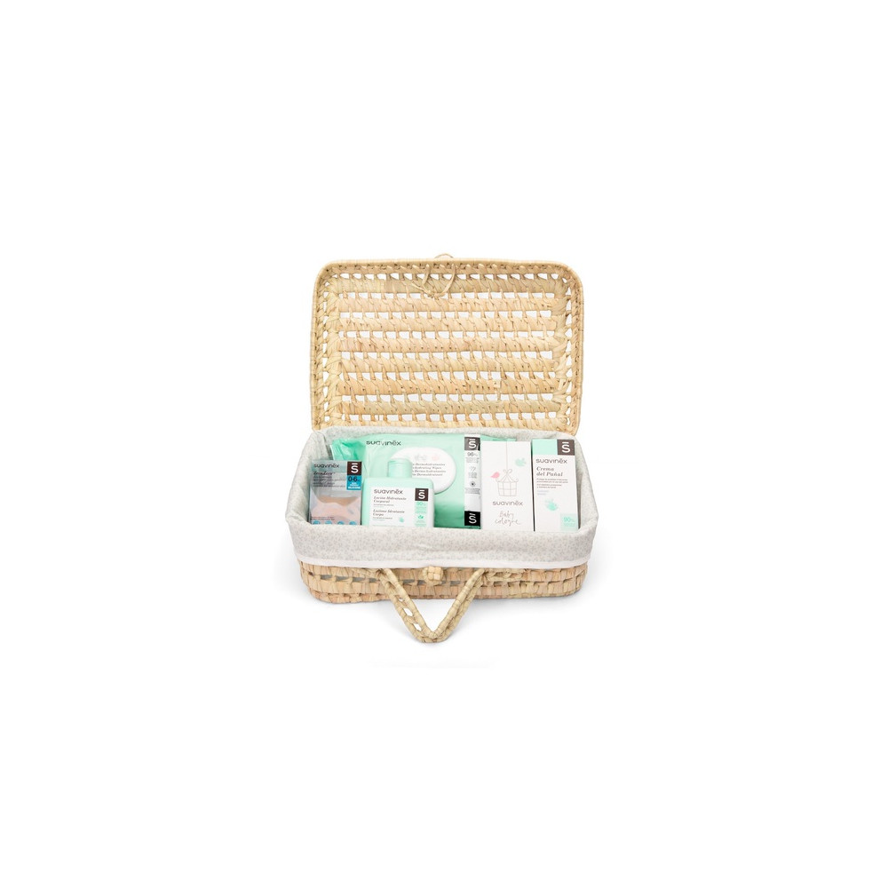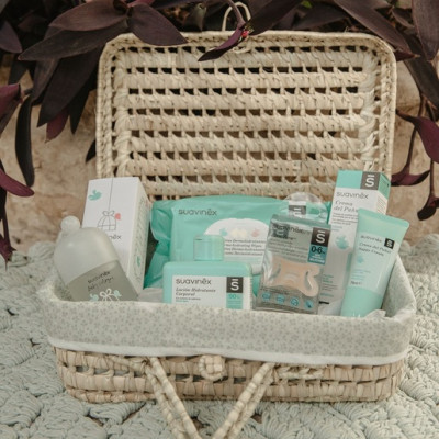 Maleta regalo bebé recién nacido con los esenciales para llevar al hospital. Regalo bienvenida al mundo.