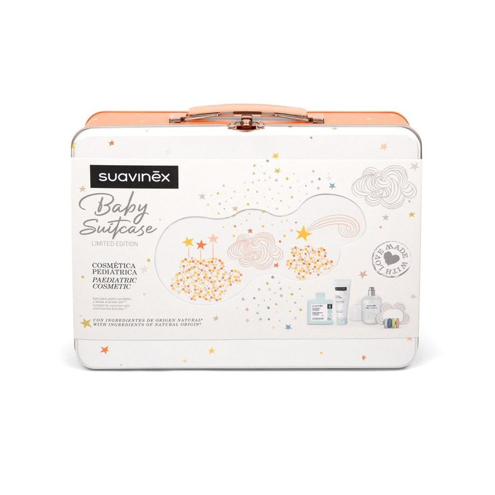 La Maleta de Bebé Suavinex con productos de cosmética pediátrica es una edición limitada excepcional que se presenta como el regalo ideal para un recién nacido. Esta hermosa maleta metálica es perfecta para organizar y guardar los esenciales de tu bebé.