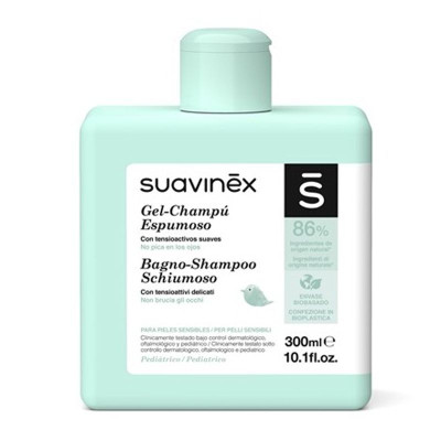 Gel Champú Espumoso Suavinex de 300 ml: Especialmente formulado para la piel delicada y el cabello del bebé, este gel champú limpia suavemente manteniendo el equilibrio natural de la piel y el cabello, evitando la sequedad y facilitando el peinado gracias a su textura espumosa. Su color y fragancia estimulan los sentidos del bebé, convirtiendo el baño en un momento agradable. No irrita los ojos y es adecuado para pieles sensibles, incluso desde el primer día.