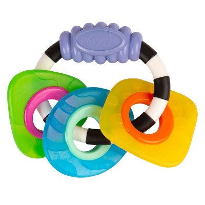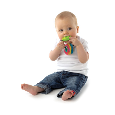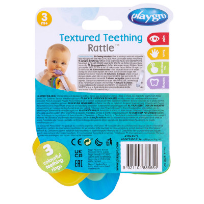 Las formas brillantes y atractivas del sonajero de dentición texturizado atraerán al bebé. Su textura suave y masticable es ideal para calmar las encías irritadas, y al agitarlo, se escucha un clic-clac, perfecto para la estimulación auditiva.