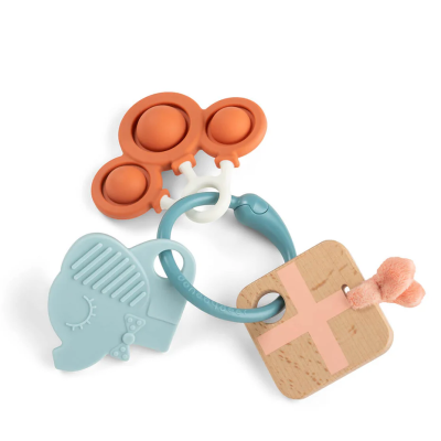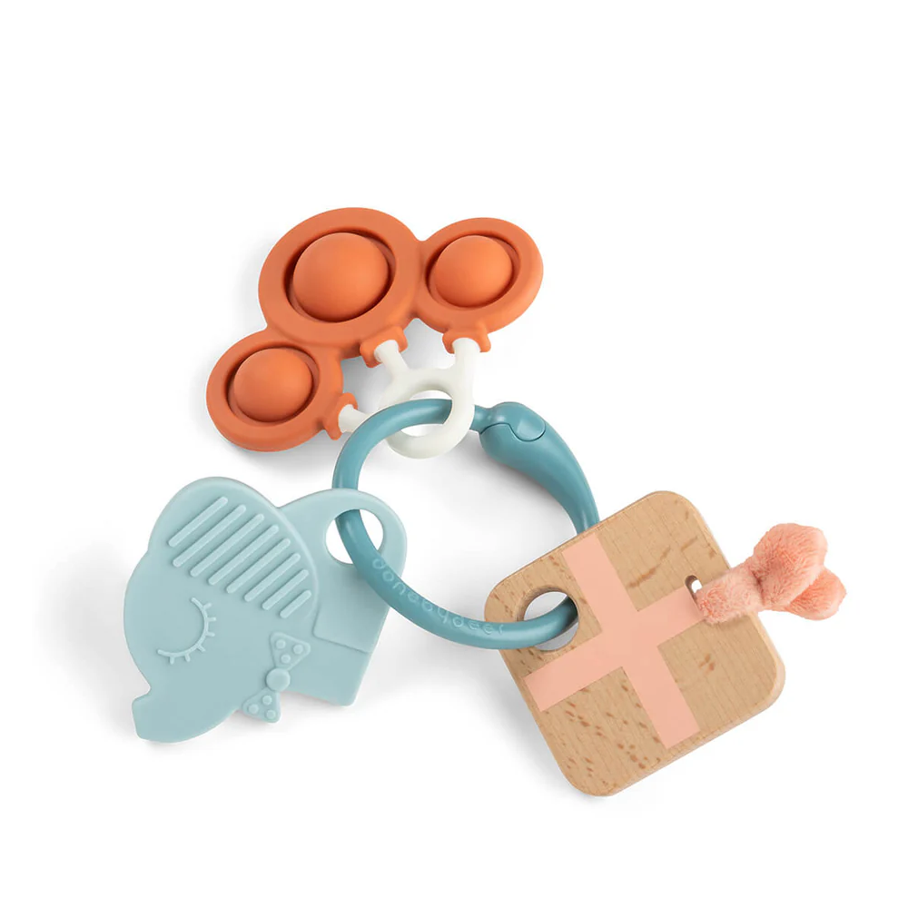 Mucho que ver, tocar y descubrir. Este anillo de actividades sensoriales reúne diferentes texturas, formas y colores en un diseño fácil de sujetar para las manitas de los más pequeños.