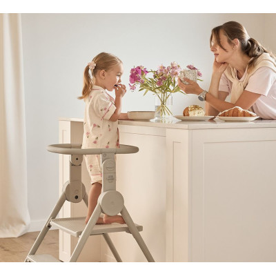 Equipada con barreras de seguridad y una barra extraíble, la torre de actividades garantiza un apoyo seguro. La barra ajustable en altura en dos posiciones, garantiza la seguridad según la edad del niño.
