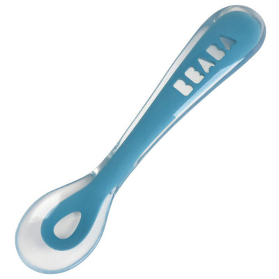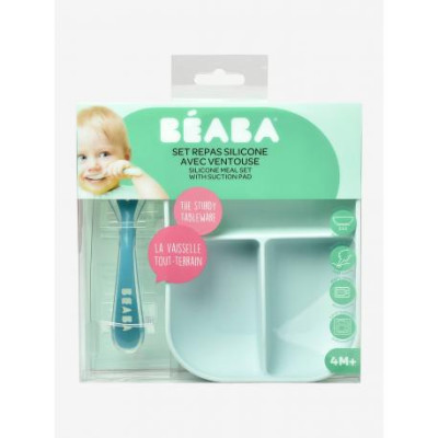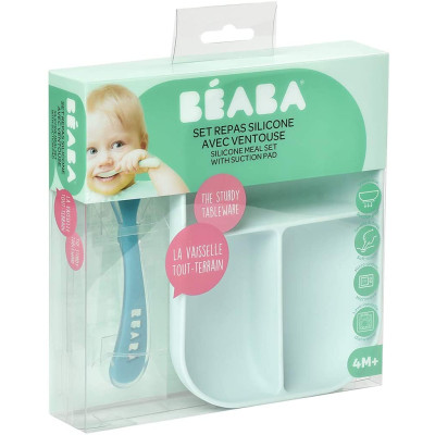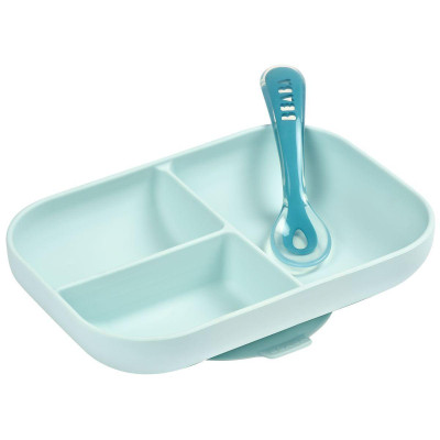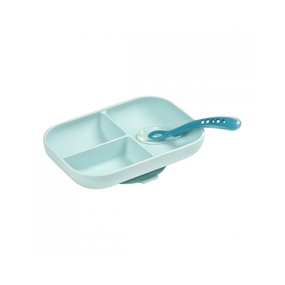 Plato compartimentos + cuchara Béaba silicona azul claro.