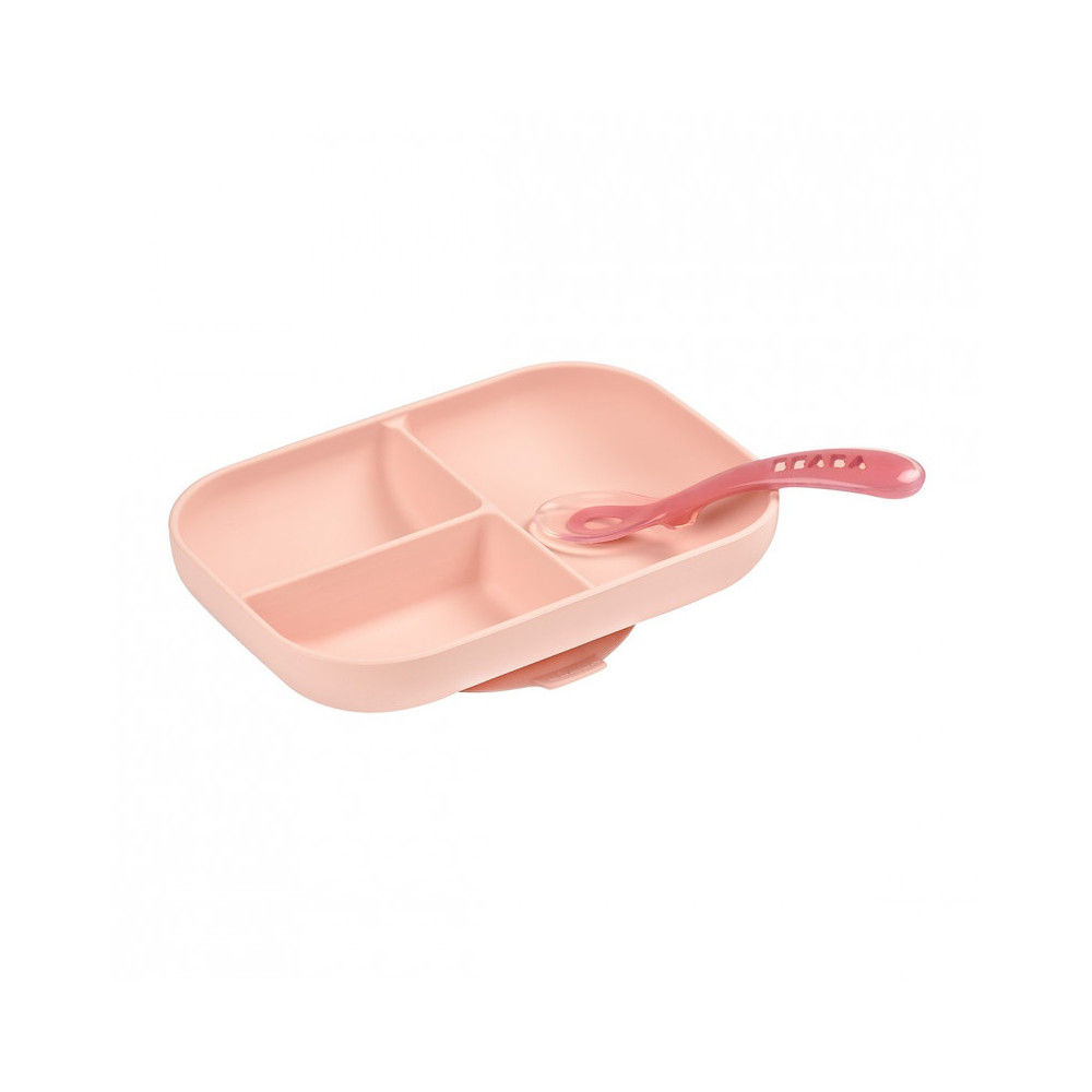 Plato compartimentos + cuchara Béaba silicona rosa.Set de plato con 3 prácticos compartimentos y cuchara de 2ª edad. ¡Conserva los sabores sin mezclar los alimentos! Con forma ergonómica y de silicona suave e irrompible, facilita el aprendizaje de tu peque durante sus primeras comidas independientes. El plato cuenta con una ventosa para que se adhiera mejor a la mesa y así evitar incidencias. El mango de la cuchara está especialmente diseñado para la mano de tu peque y la forma (parte hueca) se adapta perfectamente a su boca. Tiene un punto de apoyo para descansar y evitar el contacto de los alimentos con la mesa, así garantizas una limpieza e higiene perfectas. Características: