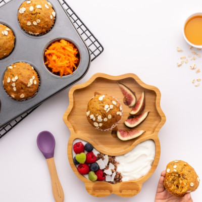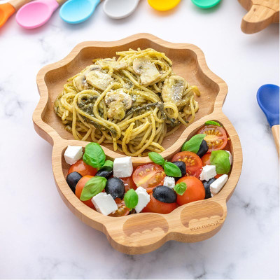 Las diferentes secciones son excelentes para alimentos secos, pero también se pueden usar para yogur y cereales. Las paredes de las secciones favorecen la auto alimentación de los niños con sus propios utensilios.