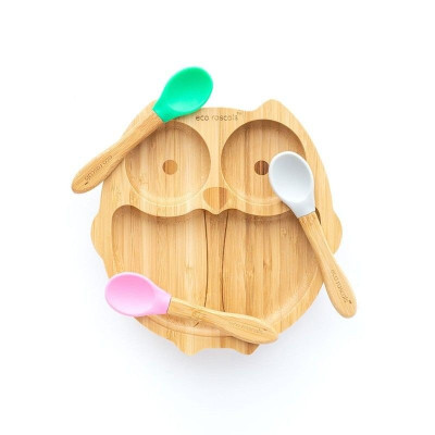 Soy un super plato con ventosa, mi base con ventosa de silicona desmontable viene en los cinco colores principales de Eco Rascals™ y funciona con un mecanismo hermético para garantizar que me sujete firmemente a la trona o la mesa.