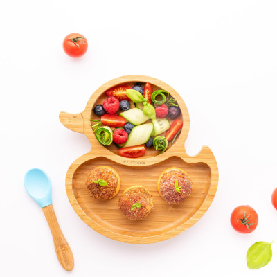 Soy un plato de bambú con ventosa, mi base con ventosa de silicona desmontable viene en los cinco colores eco rascals™ y funciona con un mecanismo hermético para garantizar que me sujete firmemente a la trona o la mesa.