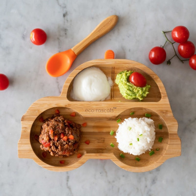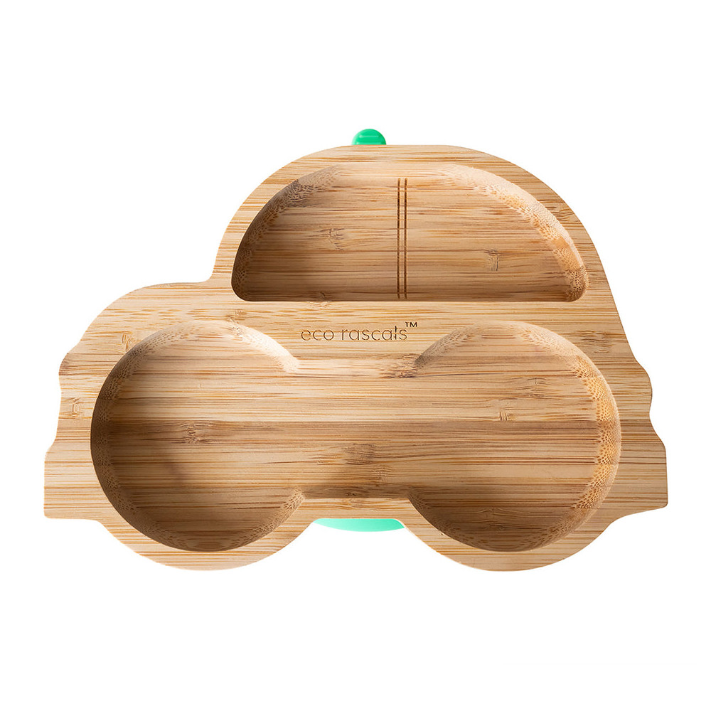 Soy un super plato de ventosa, mi base con ventosa de silicona desmontable viene en los cinco colores principales de eco rascals™ y funciona con un mecanismo hermético para garantizar que me sujete firmemente a la trona o la mesa.