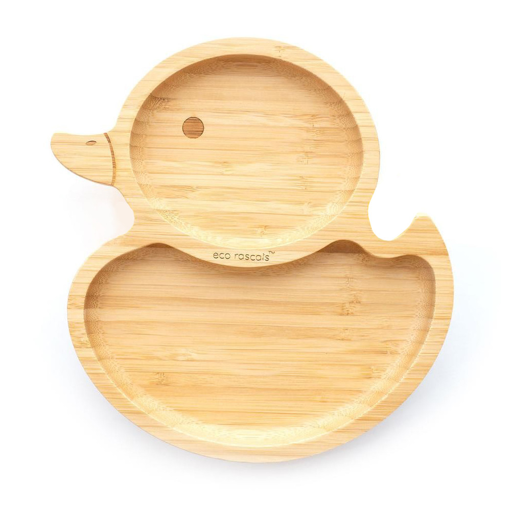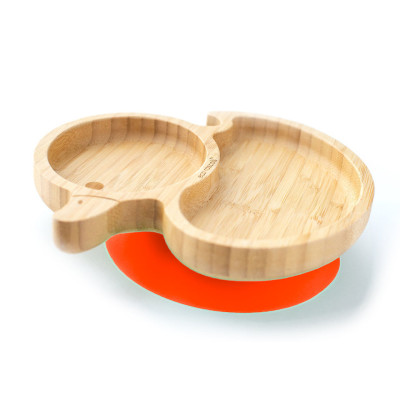 Soy un plato de bambú con ventosa, mi base con ventosa de silicona desmontable viene en los cinco colores eco rascals™ y funciona con un mecanismo hermético para garantizar que me sujete firmemente a la trona o la mesa.
