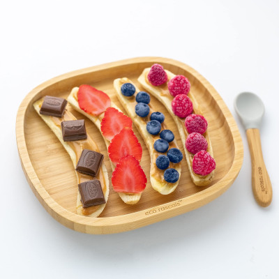 El plato abierto de bambú viene con una base con ventosa de silicona desmontable en colores de edición limitada: morado, verde y azul marino. La base con ventosa significa que los más pequeños pueden disfrutar de sus comidas sin la preocupación de mover tazones y platos que con demasiada frecuencia terminan en el suelo.