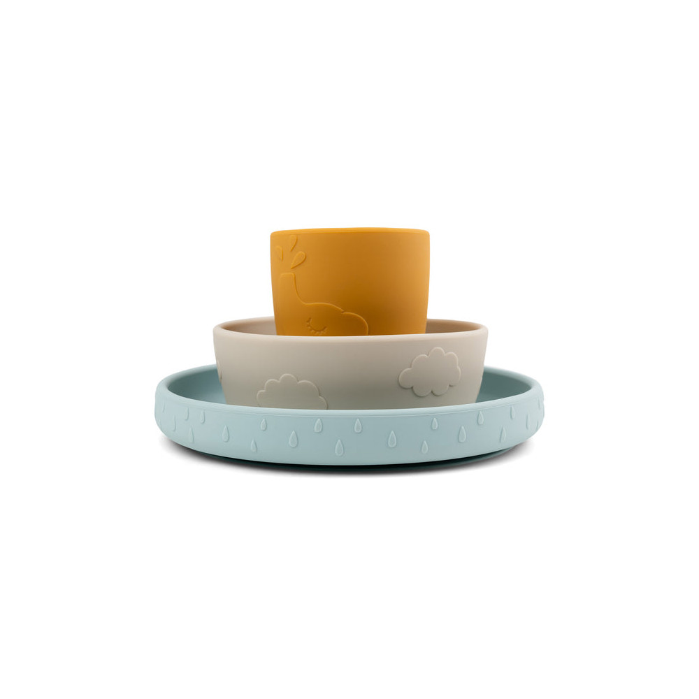El plato azul, el cuenco con arena y la minitaza mostaza están decorados con motivos en relieve de Elphee, Raffi, Birdee, gotas de agua que salpican y nubes de ensueño.