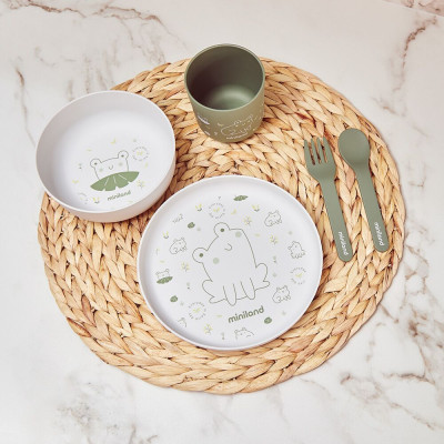 Vajilla fabricada con materiales de origen natural. Completa vajilla con alegres motivos de ranita para hacer de cada comida un momento divertido.