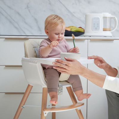 El set de 5 piezas está compuesto por un plato llano para comidas sólidas; un bol ideal para papillas, tenedor y cuchara de tamaño ideal para las primeras comidas del bebé y un vaso para beber.