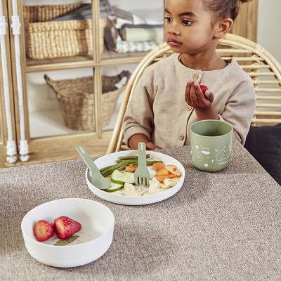 Fabricado a partir de materiales de origen 100% natural y duraderos, hacen que sea una vajilla muy duradera y ligera, para enseñar a los más pequeños la importancia de cuidar del medio ambiente y respetar el mundo en el que van a crecer.