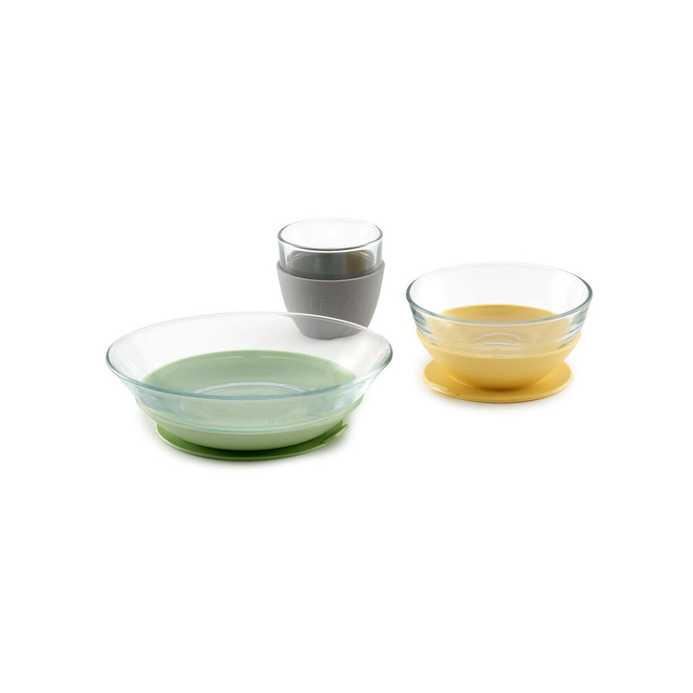 El juego incluye un plato de cristal, un cuenco y un vaso con una base blanda