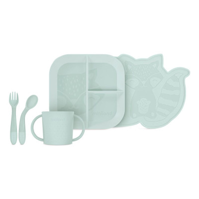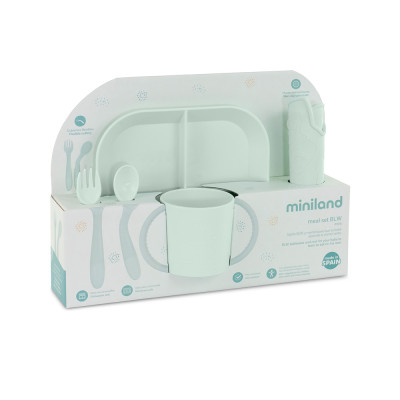 Bonito y completo juego de vajilla BLW para bebés en color verde menta, que incluye mantel, plato con tres separaciones para diferentes comidas, cubiertos flexibles para un cómodo manejo por parte del niño y vaso perfectamente adaptado a sus manitas para cuando quiera empezar a ser más independiente.