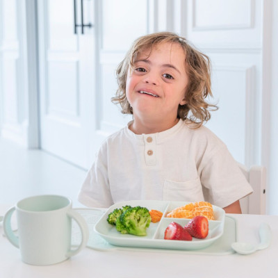 Esta completa vajilla es ideal para iniciar la alimentación complementaria autorregulada, ya que consta de un plato con separadores, que permite incluir hasta tres alimentos distintos, un mantel antideslizante, cuchara y tenedor cortos y flexibles y un vaso abierto con grandes asas para que los más peques aprendan a beber como los adultos.