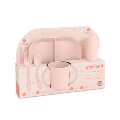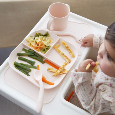 Esta completa vajilla es ideal para iniciar la alimentación complementaria autorregulada, ya que consta de un plato con separadores, que permite incluir hasta tres alimentos distintos, un mantel antideslizante, cuchara y tenedor cortos y flexibles y un vaso abierto con grandes asas para que los más peques aprendan a beber como los adultos.