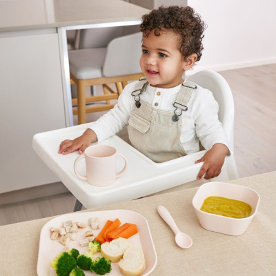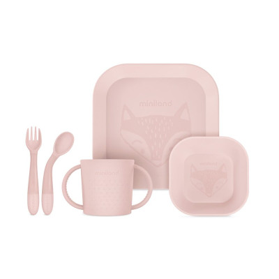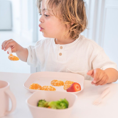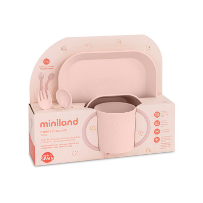 Completa vajilla con forma cuadrada que incorpora un plato llano, un cuenco, una cuchara corta flexible, un tenedor corto flexible y un vaso con asas, para hacer de cada comida un momento divertido.