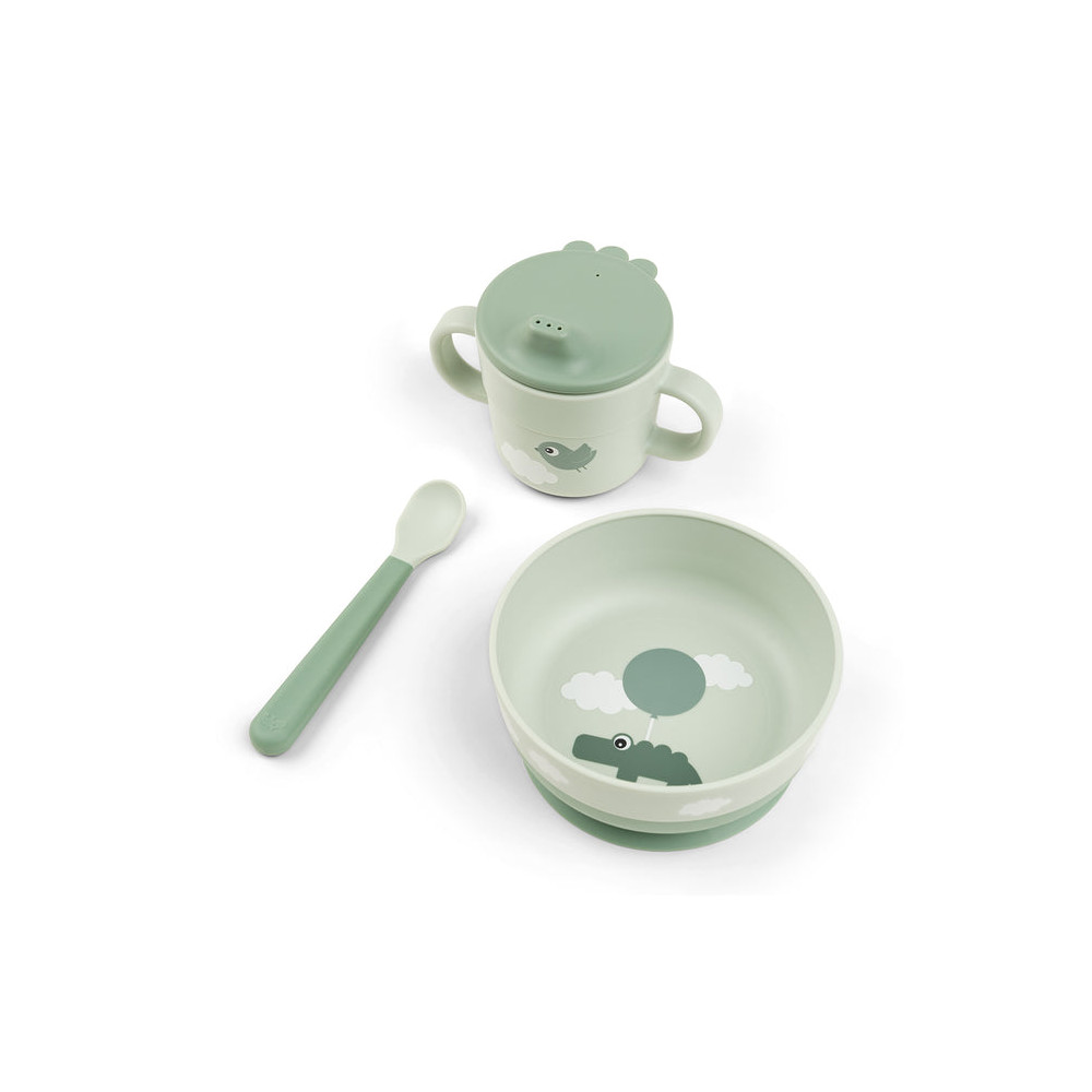 El cuenco tiene un motivo de cocodrilo entre las nubes y la taza con pico de dos asas está decorada con un feliz Birdee. Los elementos de color verde más oscuro añaden un bonito detalle bicolor.