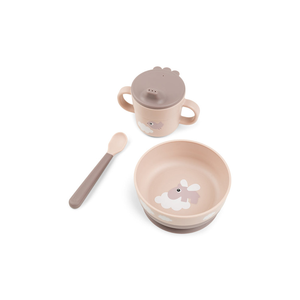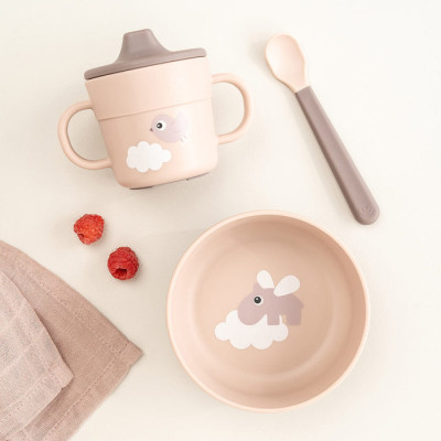 El cuenco tiene un motivo de cocodrilo entre las nubes y la taza con pico de dos asas está decorada con un feliz Birdee. Los elementos de color verde más oscuro añaden un bonito detalle bicolor.