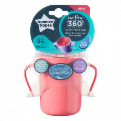 El Vaso 360º de Tommee Tippee ayuda al niño a aprender a beber como los mayores, inclinando el vaso y sorbiendo sin verter líquido por todas partes. Funciona como un vaso normal, con la ventaja de que impide los derrames. Incorpora asas.
