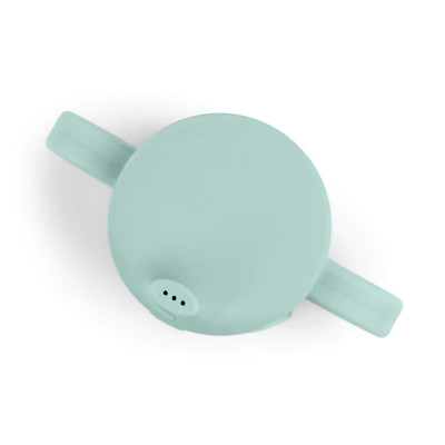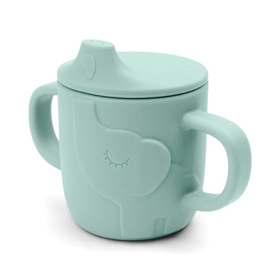 La taza Elphee de entrenamiento verde con salpicaduras de gotas de agua. Un excelente accesorio para llevar en el carrito, el automóvil o un viaje divertido al parque infantil.