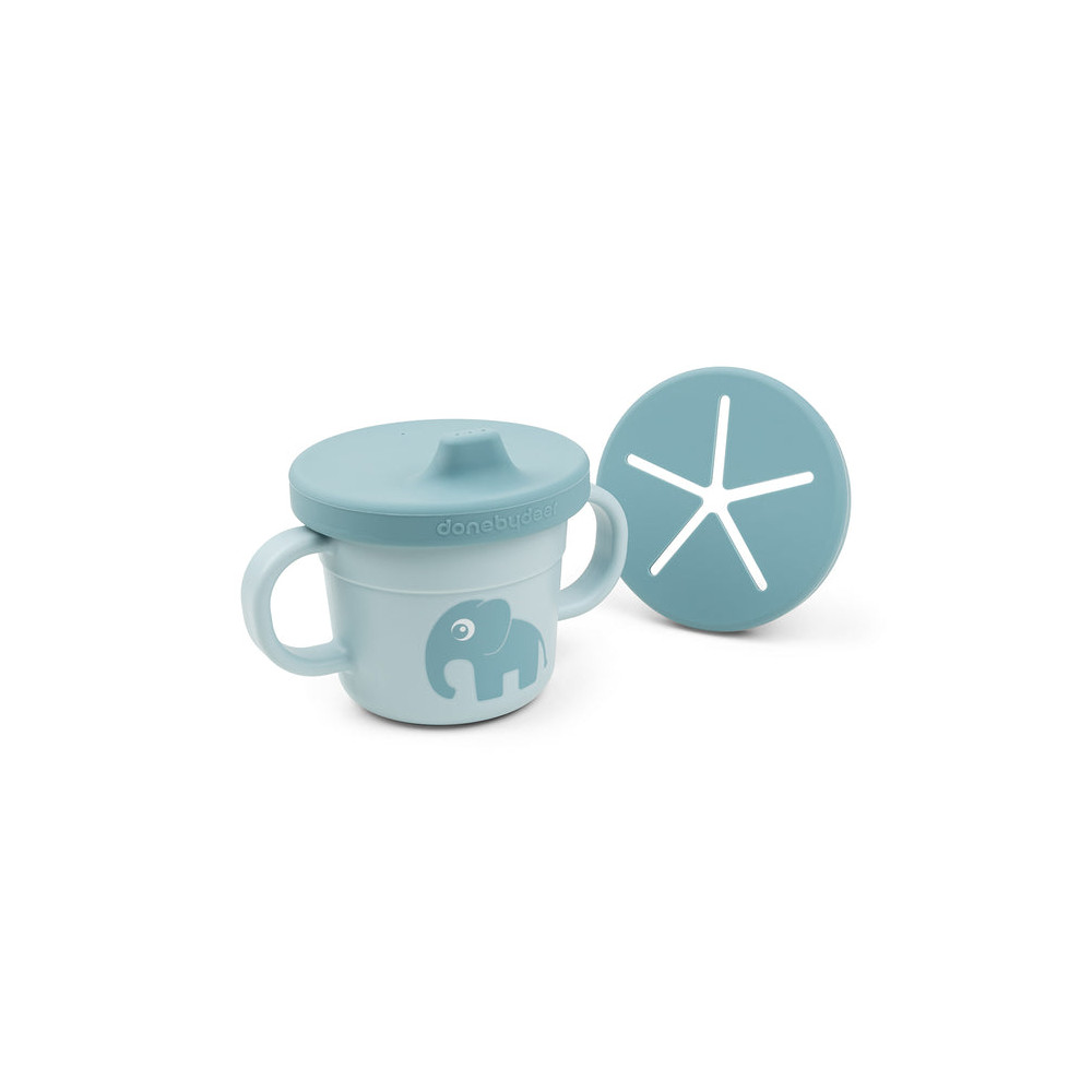 El precioso pico azul y la taza para refrigerios están impresos con el alegre elefante, Elphee en un lado y las huellas de Elphee en el otro. El azul más oscuro de los párpados añade un bonito detalle bicolor.