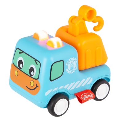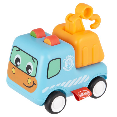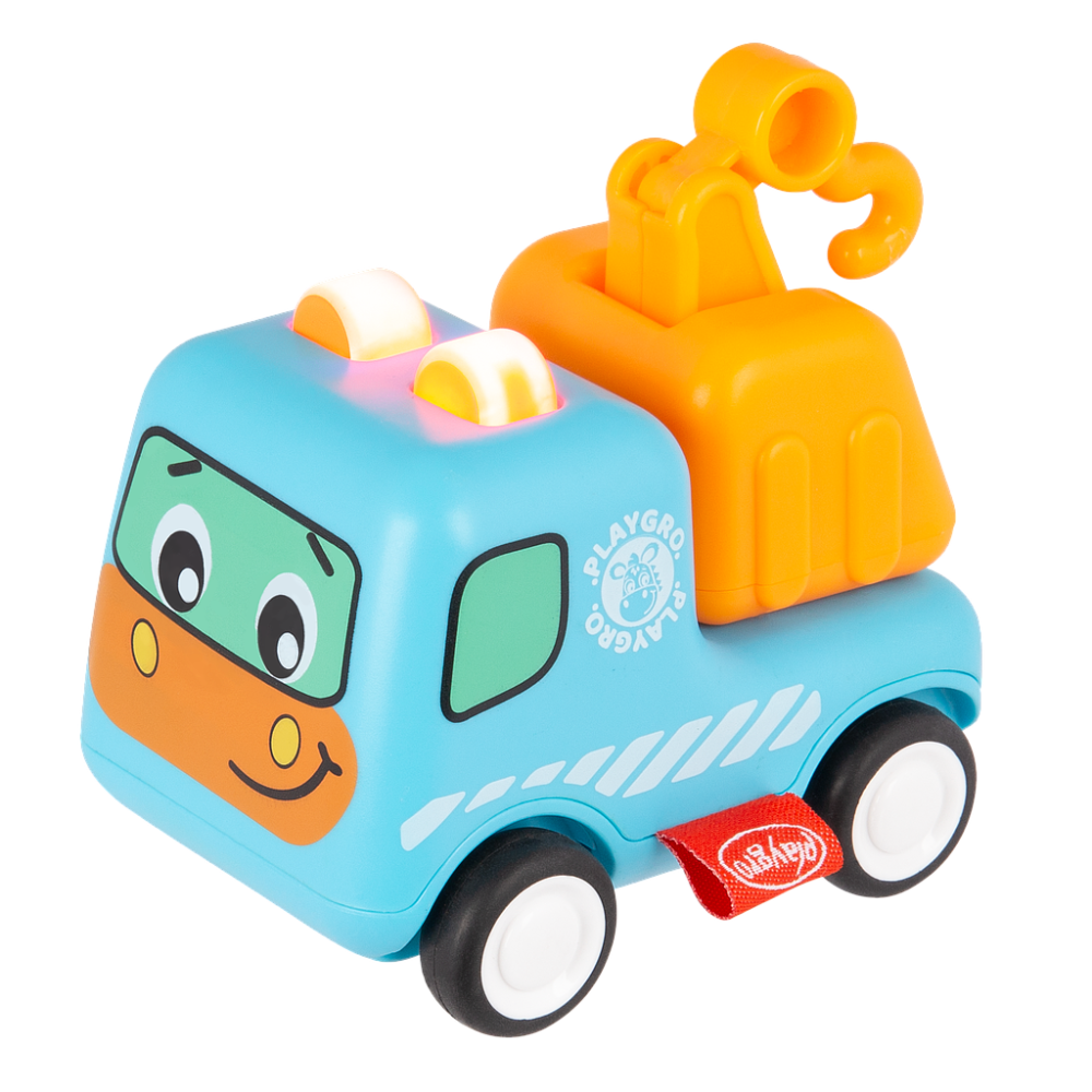 Las suaves ruedas de goma mantienen los suelos duros seguros, y sus ojos blancos y negros con una carita adorable lo hacen irresistible. La acción de retroceso y las piezas móviles del camión grúa fomentan el desarrollo táctil y el juego imaginativo.
